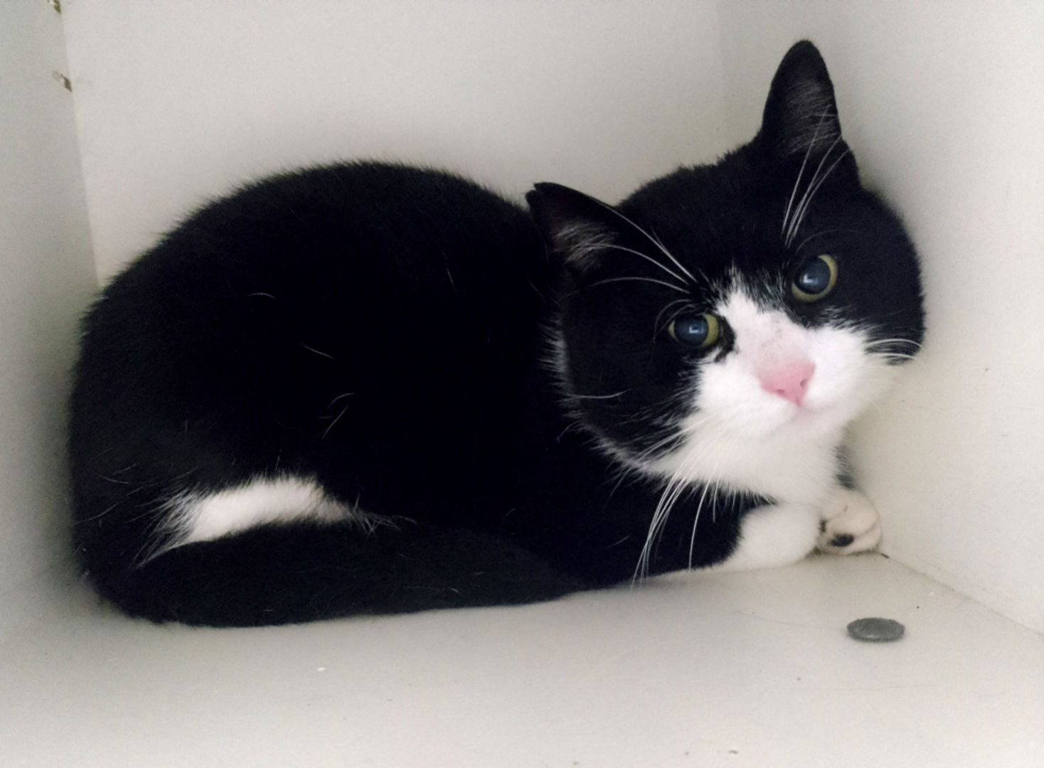 Ezra kwam bij ons terecht via een vangactie. Vanaf het eerste moment liet hij duidelijk merken dat dit avontuur voor hem allesbehalve leuk was. Het gezegde “een kat in het nauw maakt rare sprongen” werd werkelijkheid toen zijn hokje openging: Ezra zette zijn beste ontsnappingspoging in. Helaas voor hem en tot schrik van onze medewerker was zijn vlucht van korte duur.