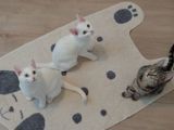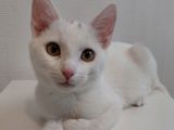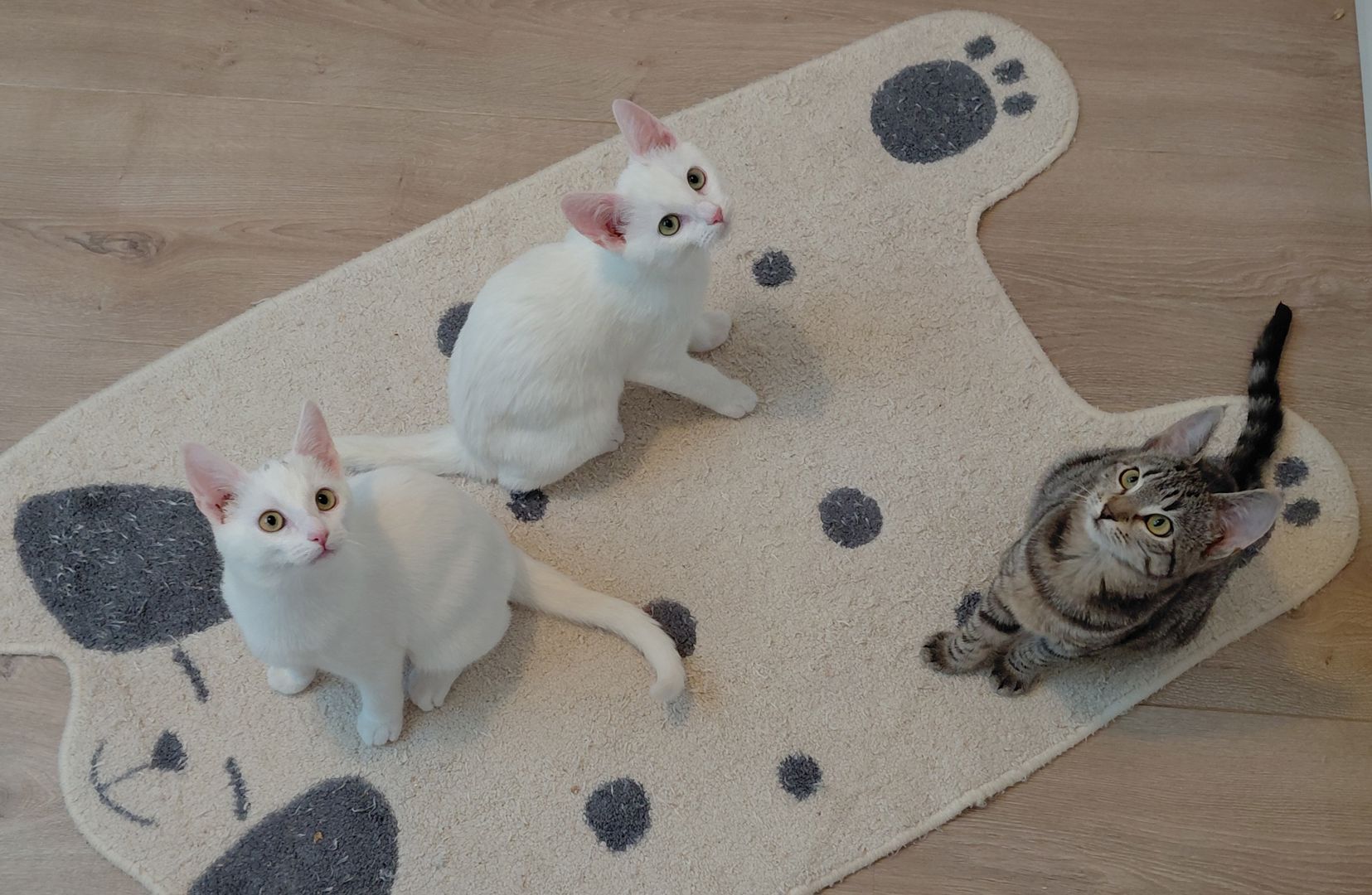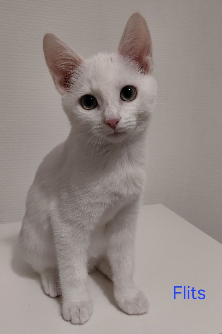 🐾 Flits is de ongekroonde Casanova. Als hij op zijn rug rolt, je aankijkt met z’n meest verleidelijke blik, een kusje geeft en dan — hop! — in je nek duikt, dan smelt je gewoon. Een charmeur in hart en nieren. Hij heeft wat meer rust in z’n billen dan de twee dames. Voor hem zit geluk in kleine dingen. Geef hem geen duur speeltje, maar één enkele houtkorrel uit de kattenbak en zijn dag kan niet meer stuk. Flits is helemaal wit met een paar verdwaalde grijze haartjes in zijn nek. Hij heeft prachtige groene oogjes en een klein knikje in zijn staart.