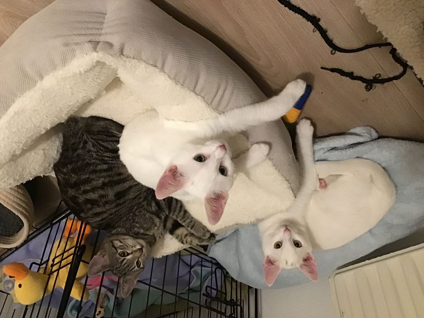 De twee zusjes Fientje en Fiep, en hun broertje Flits kwamen zwaar ondervoed in het asiel terecht. Maar dankzij goede zorgen, veel liefde en heel veel knuffels zijn ze uitgegroeid tot vrolijke, gezonde en levenslustige katjes.