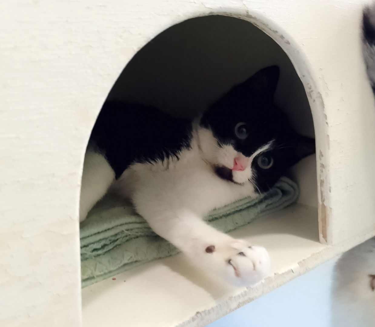 Wat Lennox enorm helpt, is de aanwezigheid van een (jonge) sociale kat. Ze zoekt duidelijk steun bij soortgenoten en voelt zich veel zekerder wanneer er een kattenvriendje in de buurt is.