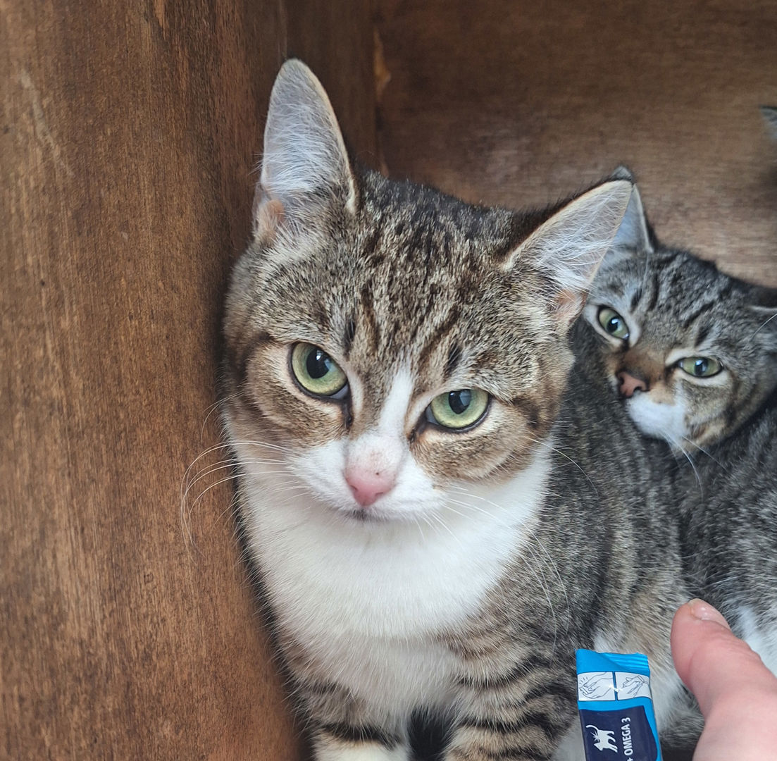 Moon is geen poes die we als enig kat gaan plaatsen. Ze heeft een andere sociale kat nodig die haar helpt om te laten zien dat de wereld niet zo eng is. Een maatje dat haar op 'sleeptouw' meeneemt in het dagelijks leven en haar helpt groeien.