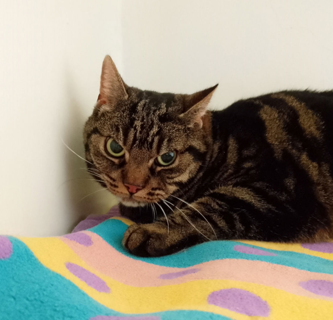 Osiris is een 13-jarige poes die samen met poes Anubis bij ons in de opvang gekomen nadat hun eigenaar helaas is overleden. Voor Osiris was dat een enorme verandering, en dat merkten we meteen: in het begin vond ze alles ontzettend spannend. Ze kroop het liefst helemaal achterin haar hokje weg, alsof ze zich even wilde verstoppen voor de wereld.