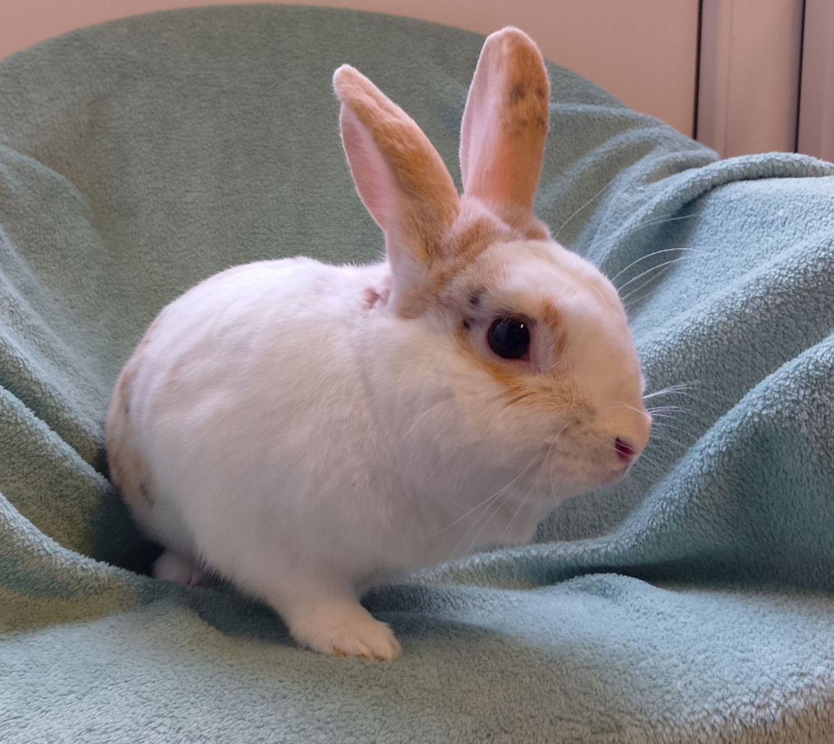 Omdat hij nu bij ons binnen de winter doorbrengt, kan hij pas vanaf mei weer naar buiten (dan maakt hij voor komende winter weer een wintervacht aan om de winter van 2026 goed door te kunnen komen als buitenkonijn).
