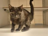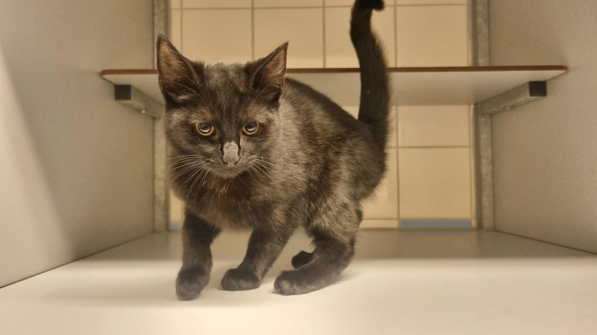 10608 Dina, jonge kat, vrouwtje. Gevonden op 15-10-25 in Barrahus, Bredyk, Kwam onder motorkap vandaan, bleef daar ook in terug klimmen. Mogelijk meegereden? Zwart vlooienbandje. Geen chip.