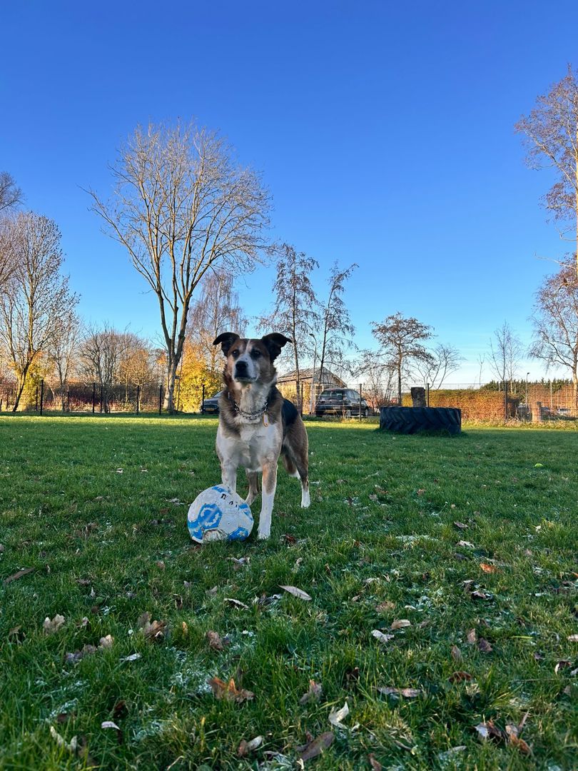 Anderhalf jaar…. Zolang heeft onze knuffelkont Jamie in de opvang gezeten! We weten nog goed dat toen hij binnenkwam we allemaal zeiden: “oh, leuk hondje, die zal er niet lang zitten.”. Maar het lot bepaalde anders. Dit middenmaatje met zijn mooie kleurtjes en lieve karakter heeft zich onverwachts tussen de langzitters geschaard. En was maandenlang een vast gegeven in de Wissel. Populair onder de vrijwilligers om mee te spelen op de speelweide, en geliefd bij de medewerkers die allemaal een band met hem hadden opgebouwd.
